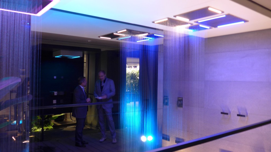 Während man inmitten der Dusch-Wasserfälle auf Holzstegen in einer Art tropischem Idyll bewegt, kann man sich kaum vorstellen, dass all das nur gerade einmal 30% dieser unterirdischen SPA-Oase ausmacht… Um das Foyer herum finden sich auf zwei Etagen eine Vielzahl einzelner Bade- und Wellnesskompositionen – Die aller meisten betriebsfähig mit laufendem Wasser und eigenem Lichtdesign – mit den unterschiedlichsten Produkten und tollen dekorativen Elementen gestaltet, wie zum Beispiel einer kapitonierten Natursteinwand, oder einer zweistöckigen, deckenhohen Green-wall. So fühlt sich jede dieser kleinen Ausstellungen wie ein separater Raum an, der immer wieder ein neues synästhetisches Erlebnis bietet.