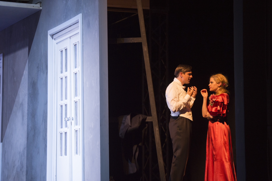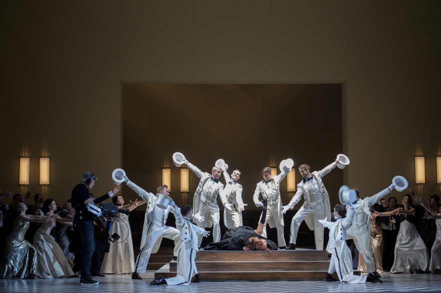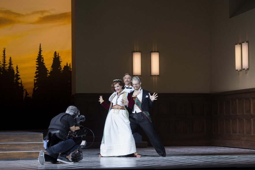 Noch völlig fasziniert von dem Orchestergraben, geschehen auf der Bühne schon bekannte Dinge….oder doch nicht? Die Handlung wird von einem Filmteam mit zu erwartenden Entourage begleitet, motiviert, auch optimiert, immer wieder unterbrochen…und…und…und. Diese Geschichte in der Geschichte läßt im Zuschauerraum anfängliches Stirnrunzeln in gefälliges Nicken übergehen. Seine Chance nutzt besonders Klaus Haderer in der Doppelrolle als Filmregisseur und gleichzeitig als Njegus…witzig, spritzig. Der Situation den richtigen Schwung gebend und doch ist die Häufigkeit der Einsätze des Filmteams maximal ausgereizt. Suchen sich doch die beiden Protagonisten Hanna Glawari (Marlis Petersen) und Graf Danilo Danilowitsch (Iurii Samoilov), finden sich, können es nicht geschehen lassen und trifften wieder auseinander….und dies nicht nur in ihrer Rolle, sondern auch in deren erlebbaren Realität. Eine Prise Raffinesse, die die Süße des Spiels mit der nötigen Portion Wehmut mildert.