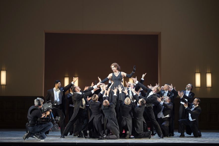 Noch völlig fasziniert von dem Orchestergraben, geschehen auf der Bühne schon bekannte Dinge….oder doch nicht? Die Handlung wird von einem Filmteam mit zu erwartenden Entourage begleitet, motiviert, auch optimiert, immer wieder unterbrochen…und…und…und. Diese Geschichte in der Geschichte läßt im Zuschauerraum anfängliches Stirnrunzeln in gefälliges Nicken übergehen. Seine Chance nutzt besonders Klaus Haderer in der Doppelrolle als Filmregisseur und gleichzeitig als Njegus…witzig, spritzig. Der Situation den richtigen Schwung gebend und doch ist die Häufigkeit der Einsätze des Filmteams maximal ausgereizt. Suchen sich doch die beiden Protagonisten Hanna Glawari (Marlis Petersen) und Graf Danilo Danilowitsch (Iurii Samoilov), finden sich, können es nicht geschehen lassen und trifften wieder auseinander….und dies nicht nur in ihrer Rolle, sondern auch in deren erlebbaren Realität. Eine Prise Raffinesse, die die Süße des Spiels mit der nötigen Portion Wehmut mildert.