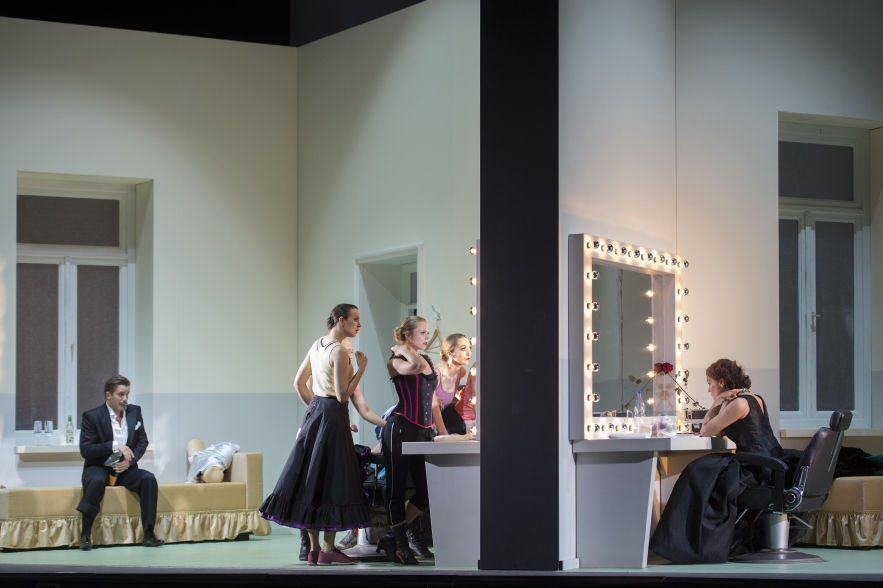 Doch das soll sich bereits beim Intro wandeln, auf der Bühne sitzt lakonisch „die Glawari“ (Marlis Petersen) so ganz ohne jeglichen Glanz in Ihrer Garderobe und harrt der Dinge…..einige gesangliche Lockerungen lassen erahnen, dass auch dies hier zum Alltag gefeierter Bühnenstars gehören kann.