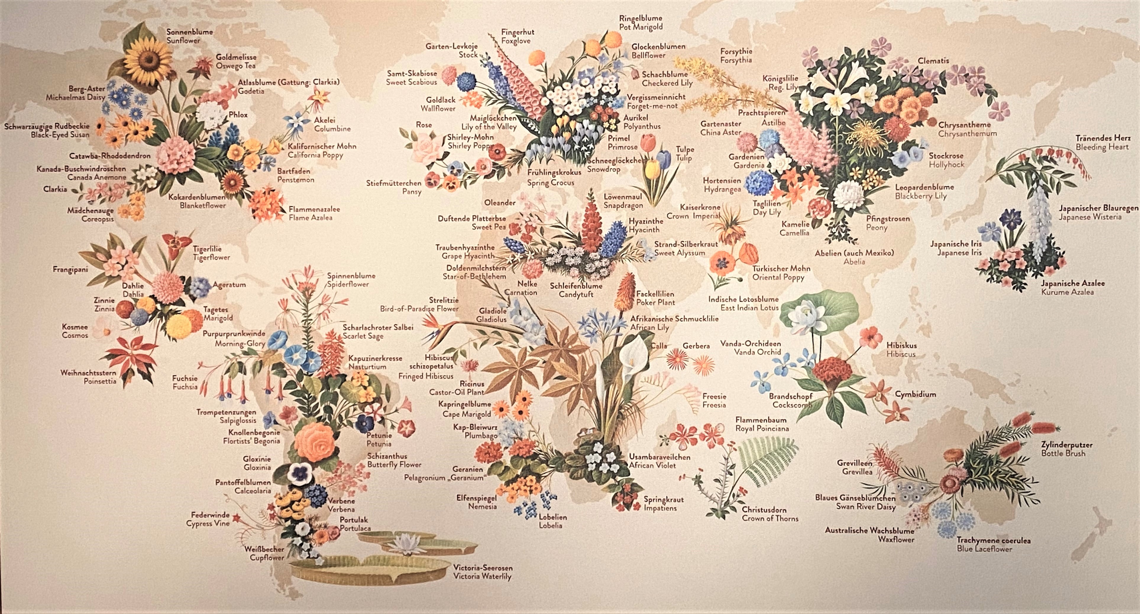 Sehr interessant liest sich die Weltkarte der Blumen, die Herkunft bei uns schon lange angesiedelter Blüher. Gleich zu Beginn der Tour fasziniert dieses übergroße Format die Aufmerksamkeit in seinen Bann. Flankiert seitlich von floralen Skulpturen.