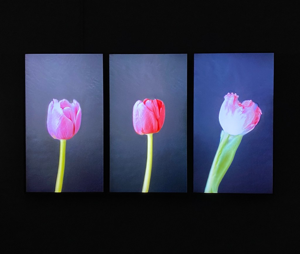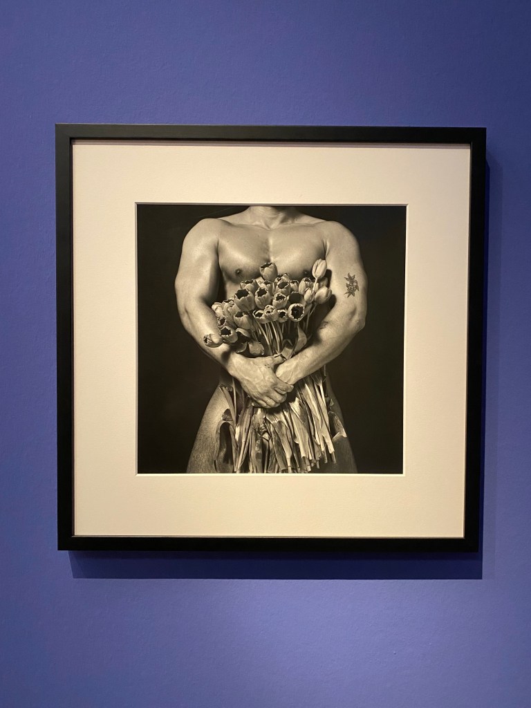 Mit seiner Fotografie „Tulpen“ präsentiert der Künstler einen männlichen Torso mit künstlerisch gestaltetem Tulpenstrauss. Dabei lenkt das Motiv den Blick auf die umfangenden Arme und Hände. Das Werk stellt auf eine Homage an Robert Mapplethorpe (1946-1989) dar und dessen erotisch motivierten Männerakte und Blumenarrangement.